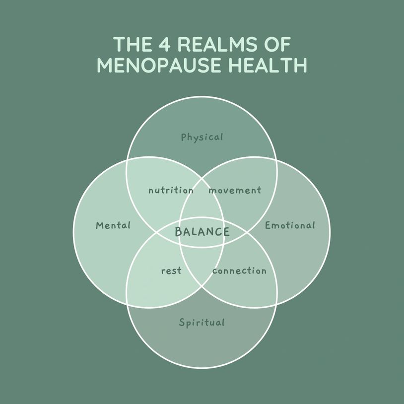 Menopause impacts every part of who we are — body, mind, heart, and spirit. In my coaching, I use movement, nutrition, rest, and connection as practical entry points to bring balance across the four realms of health: physical, mental, emotional, and spiritual. Finding that balance is key to increasing your healthspan and allowing you to keep doing the things you love and being the person you love, no matter your age.